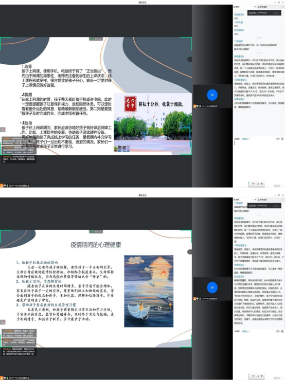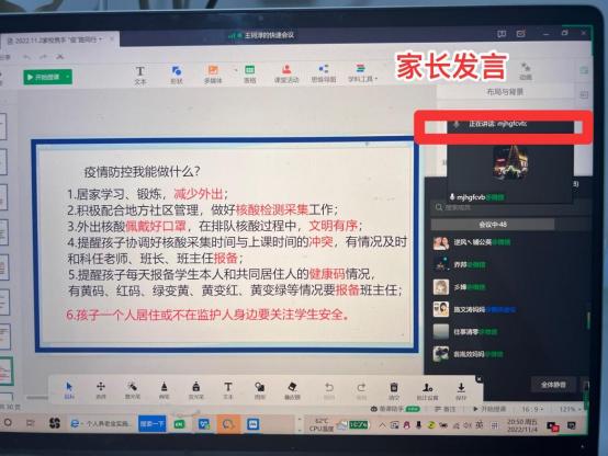 家长会在老师们亲切的问候声中拉开了帷幕, 围绕防疫安全、居家安全、防火安全、网络安全等方面强调了疫情期间要遵守的疫情防控规则和注意事项,提醒家长和学生树立安全意识,共同营造安全健康的居家学习环境。提醒家长每日要及时采集核酸,上报核酸结果,筑起抗击疫情的防护墙!此外,班主任们也分享了居家学习的心理调适方法及亲子沟通小妙招。希望家长们从心出发,提升亲子相处之道,做好孩子们成长路上的护航者与 引路人。班主任、家长们用心聆听、认真记录,通过评论区留言、班级群讨论等方式与老师交流了自己的感受。这种云上别样的爱有效地推动了家校联系,增强了家校共育的实效性!