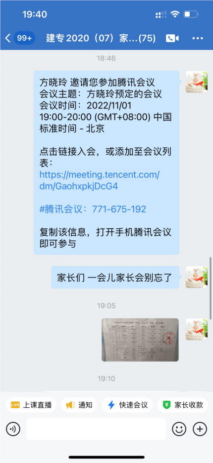 班主任积极准备家长会会议内容和开展线上家长会需要的设备,通过班级微信群向家长们发出线上家长会的邀请通知,暖心提醒家长提前安排好时间,做好准备工作,确保能够准时参加 本次线上家长会。
