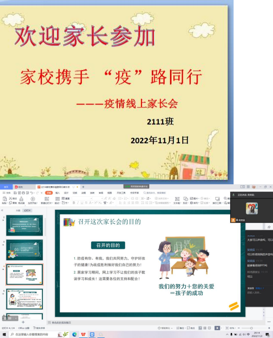 为切实做好线上教学期间学校疫情防控工作及课堂教育教 学管理工作,进一步加强家校联系,夯实“社会、学校、家庭”三结合的教育网,促进学生心理健康成长,11月 1 日,学校德 育处召开2022-2023 学年第一学期线上家长会。