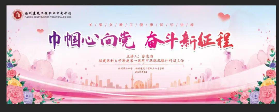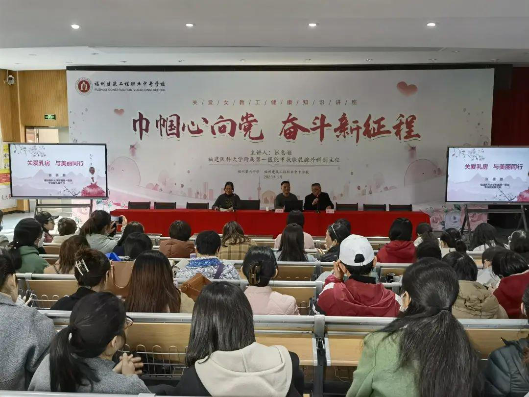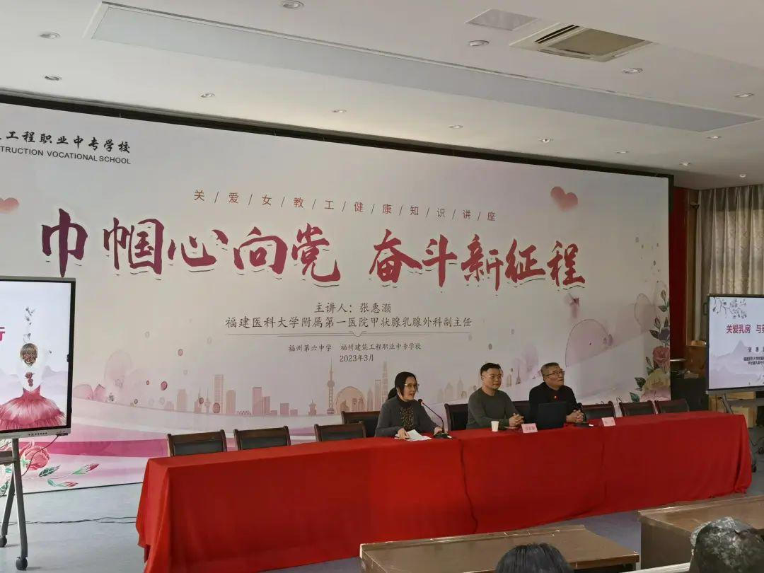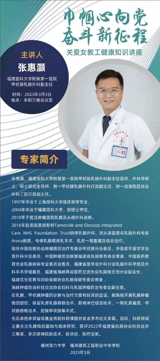 在 2023 年国际三八妇女节前夕,福州建筑工程职业中 专学校邀请福建医科大学附属第一医院甲状腺、乳腺外科副 主任张惠灏医生开展“巾帼心向党,奋斗新征程”——关爱 女教工健康知识讲座。